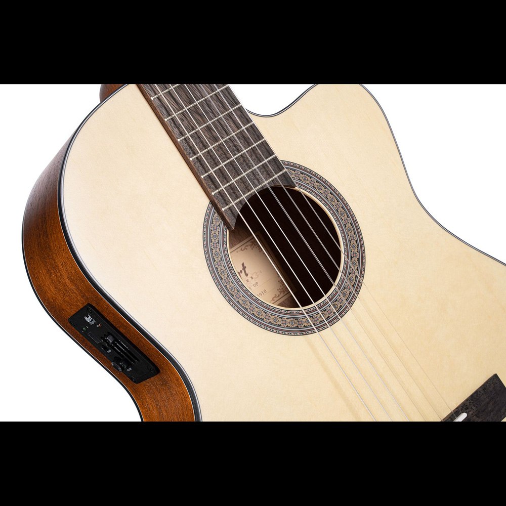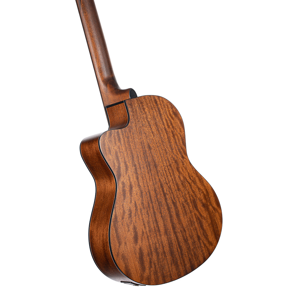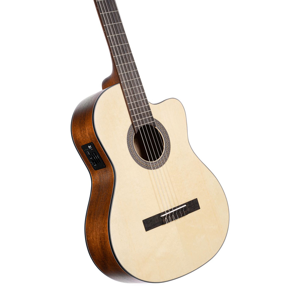 A hagyományos stílusú AC-modelleket újraterveztük annak érdekében, hogy egy tökéletesebb rezonanciát adjunk az autentikus klasszikus gitár hangzásának. A faanyagok remek kombinációjával hagyományos, mély és csodálatossan teli hangzást érhetünk el. A Cort AC széria a tanulók számára is megkönnyíti a játékot, mivel nem szükséges tökéletes precizitás a jó hangzás érdekében. Az AC120CE cutaway elektro-akusztikus gitár fenyő fedlappal, mahagóni hát- és oldallapokkal és babér fogólappal rendelkezik és Savarez húrokkal van szerelve.