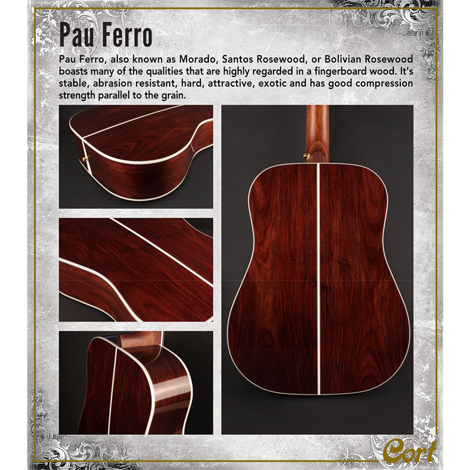 A Cort Gold széria nevével fémjelzett ATV (Aged To Vintage) eljárás lehetővé teszi, hogy a tömör Sitka fenyő tető jobban megérjen és a pórusai jobban kinyíljanak. Az ATV egy pörkölő eljárás, ami a Gold-A8-nak egy nagy, nyílt hangzást ad, ami természetes, mégis erőteljes és meleg középpel rendelkezik. Ezt erősítik a Pau Ferro hát- és oldallapok. A fokozott keménységű UV lakkozás megvédi a hangszert és hangminőségét, és most a fényes natúr mellett light burst színben is elérhető. A Fishman innovatív, szofisztikált tervezése, a Fishman Flex Blend System széleskörű hangszabályozást biztosít a beépített hangoló mellett.