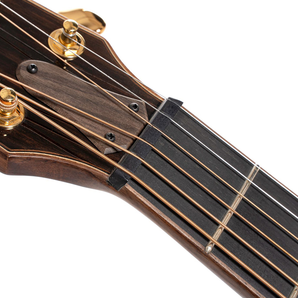 Konstrukció: dovetail nyakcsatlakozás, Grand Concert testforma, velencei cutaway, oldalsó hanglyuk, bevel kartámasz