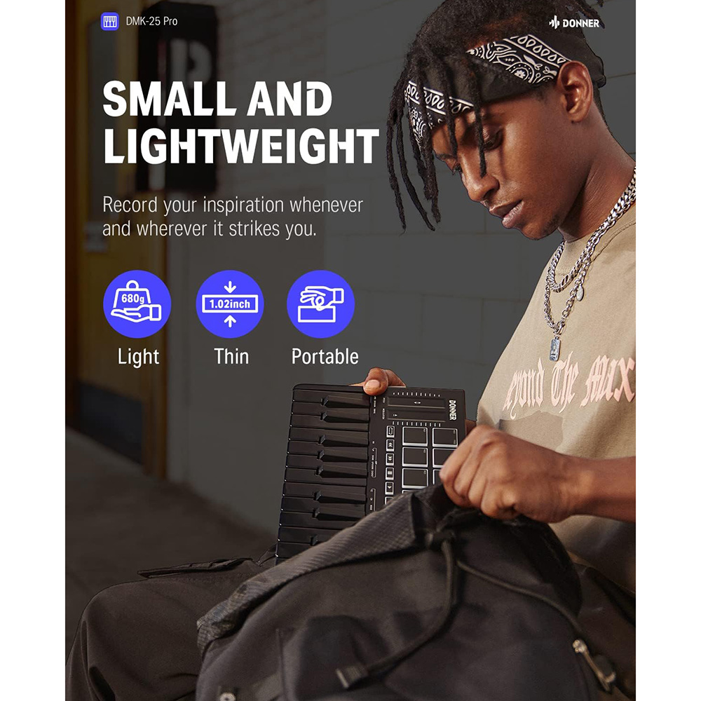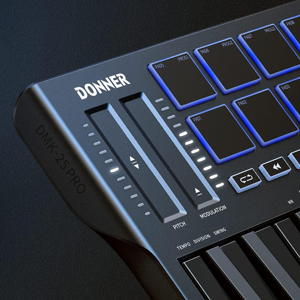 A DMK-25 Pro egy hordozható, kezdők számára ideális minden-egyben MIDI billentyű. Ez az első olyen Donner billentyű, ami Cubase-szel és Melodics-szal kompatibiliis, jelentős fejlesztásekkel. A kompakt panel dizájn és a HD OLED kijelző, a kompakt billentyűkkel és a 8 reszponzív perkussziópaddal, és komoly funkciókkal új kreatív élmény ad.
