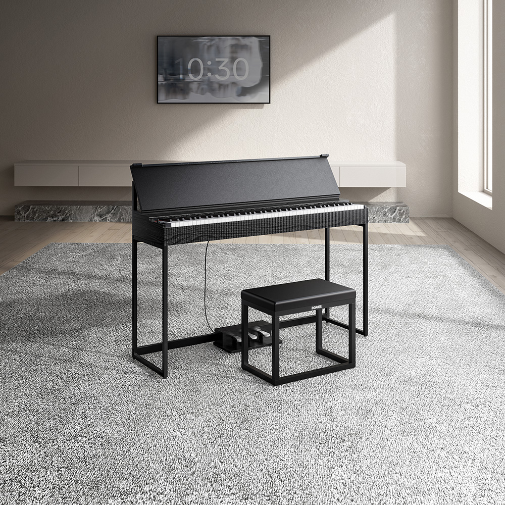 Zökkenőmentesen illeszkedik a skandináv stílusú lakberendezéshez. Letisztult geometrikus vonalakkal és integrált, puha tapintású, klasszikus bőrborítású fedlappal. Ez nem csak egy digitális zongora, hanem egy otthoni műalkotás.