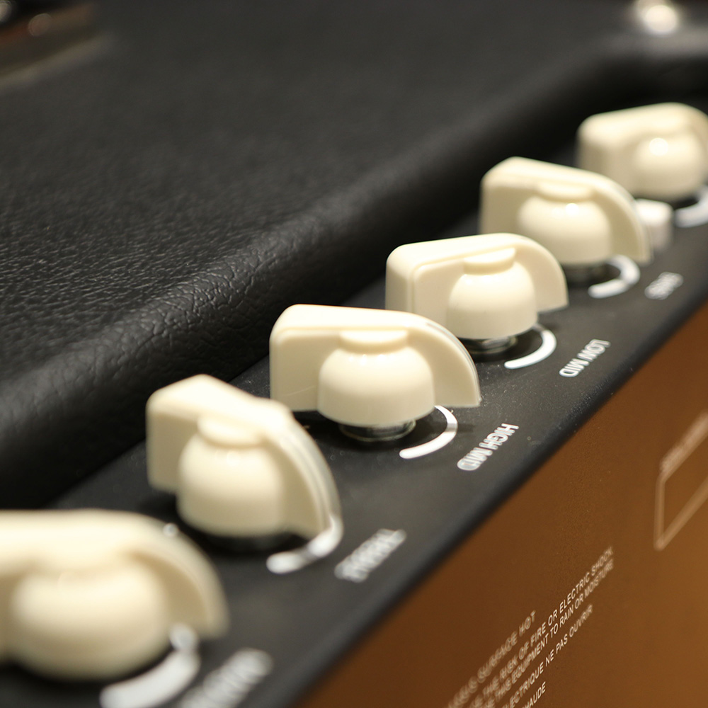 Kontroll: Gain, Bass, High Mid, Low Mid, Treble, Master, Aux In, Speaker