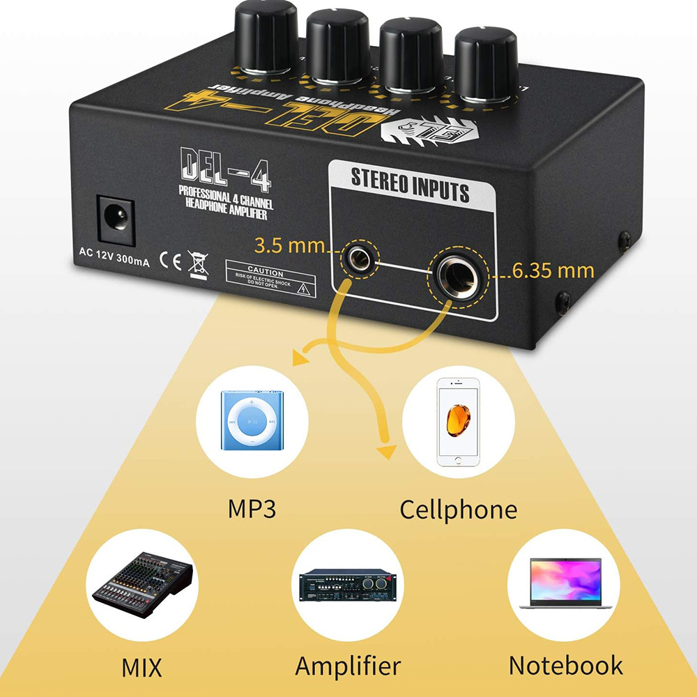 Ultra-alacsony zajszint: Ez a fejhallgató erősítő egyeteln stereo forrást oszt meg 4 fejhallgatóval. SNR (jel-zaj arány) S/N: <100dB.
