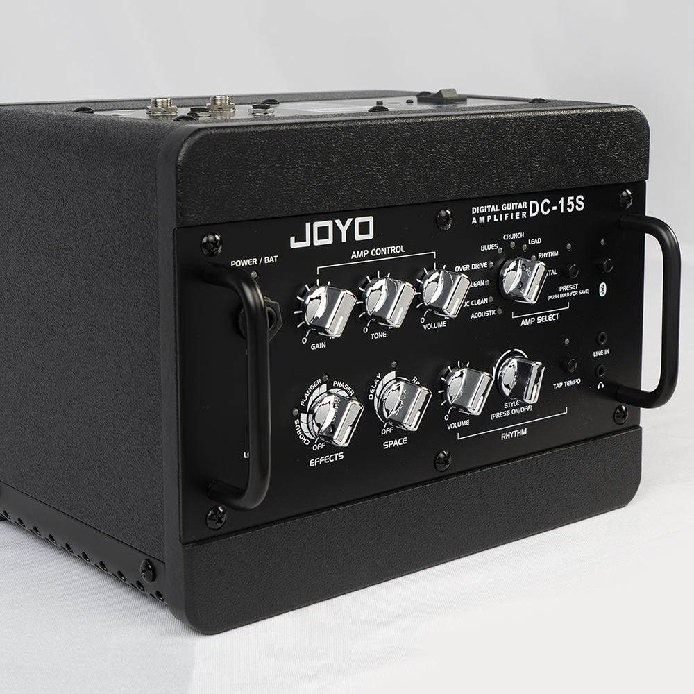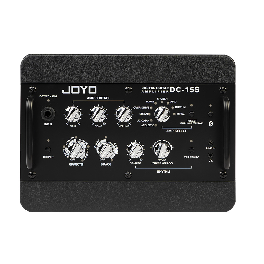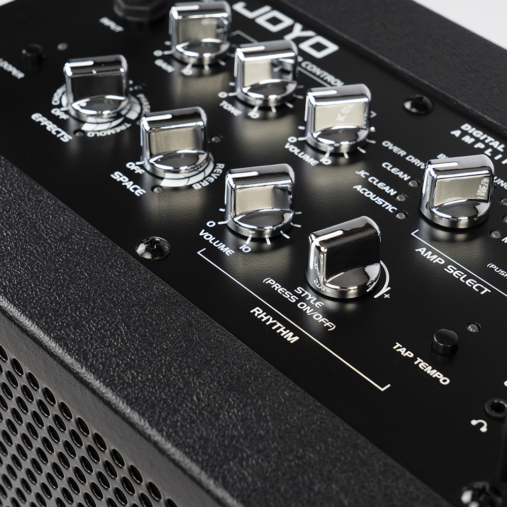 Vezérlők: Gain, Tone, Volume (for amp), Space Effects, Modulation Effect, Amp select, Amp preset, Bluetooth, Looper, Drum volume, Drum style, Tap tempo