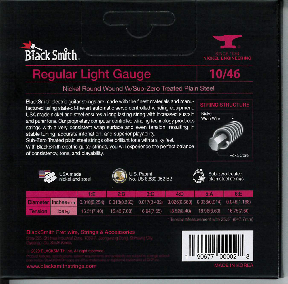 A BlackSmith elektromos gitár húrok a legkiválóbb alapanyagokból készülnek a legmodernebb tekercselő berendezés használatával. Az USA-ban gyártott nikkel és acél hosszú élettartamot és megnövelt hangkitartást biztosít. Számítógépvezérelt technológiával egyenletes tekercselést és húrnyomást kapunk, ami stabil hangolást, pontos intonációt és kiváló játszhatóságot eredményez. A fagyasztással kezelt acél húrok csilingelő hangzást és lágy tapintást adnak.