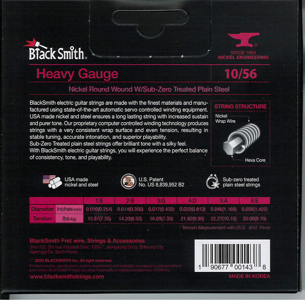 A BlackSmith elektromos gitár húrok a legkiválóbb alapanyagokból készülnek a legmodernebb tekercselő berendezés használatával. Az USA-ban gyártott nikkel és acél hosszú élettartamot és megnövelt hangkitartást biztosít. Számítógépvezérelt technológiával egyenletes tekercselést és húrnyomást kapunk, ami stabil hangolást, pontos intonációt és kiváló játszhatóságot eredményez. A fagyasztással kezelt acél húrok csilingelő hangzást és lágy tapintást adnak.