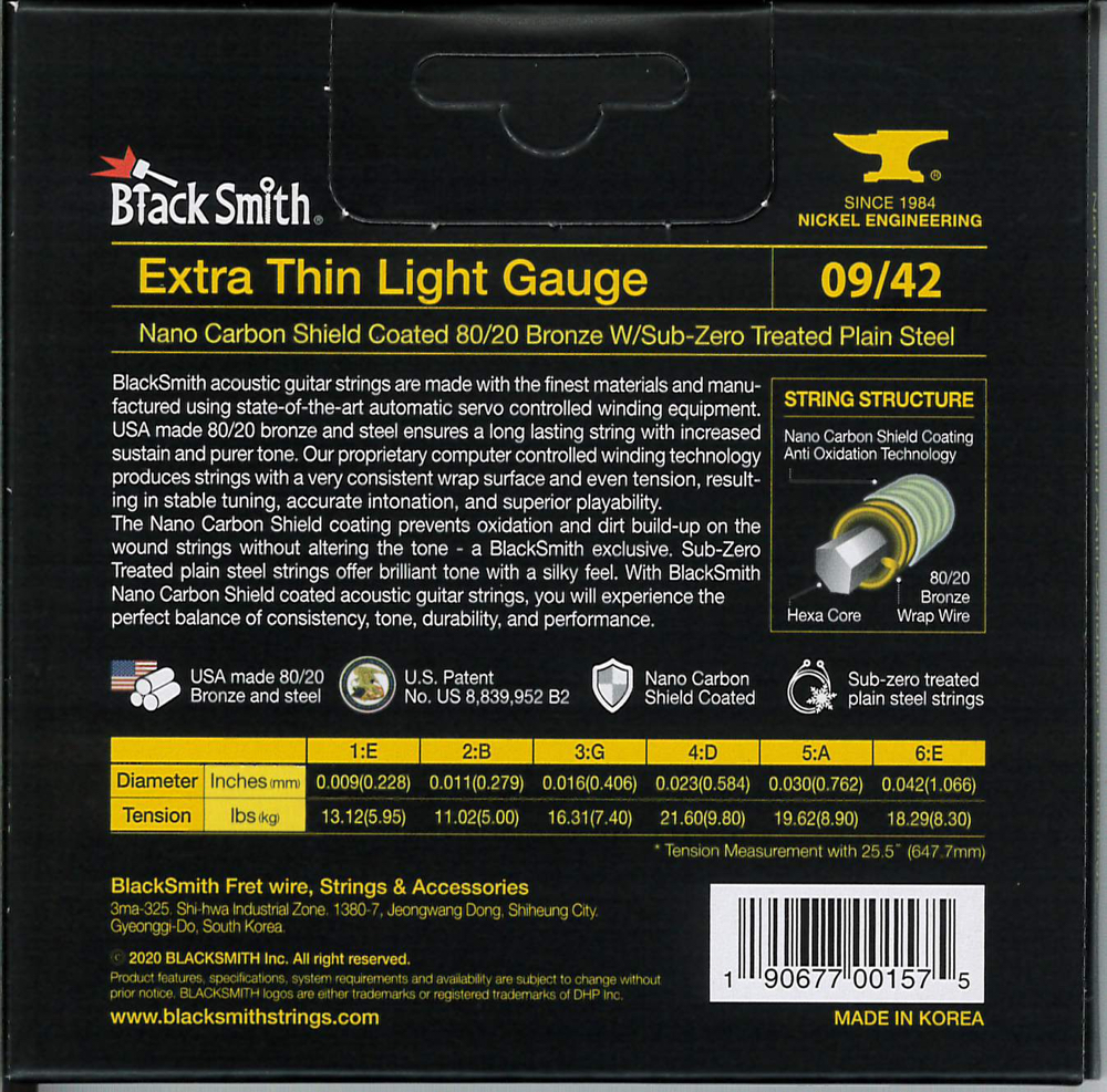 BlackSmith-exkluzív Nano Carbon Shield bevonattal rendelkezik, amely megakadályozza az oxidációt és a szennyeződések felhalmozódását anélkül, hogy a hangzást megváltoztatná. A fagyasztással kezelt acél húrok csilingelő hangzást és lágy tapintást adnak. Ez együttesen biztosítja a konzisztencia, a hangszín, a tartósság és a teljesítmény tökéletes egyensúlyát.