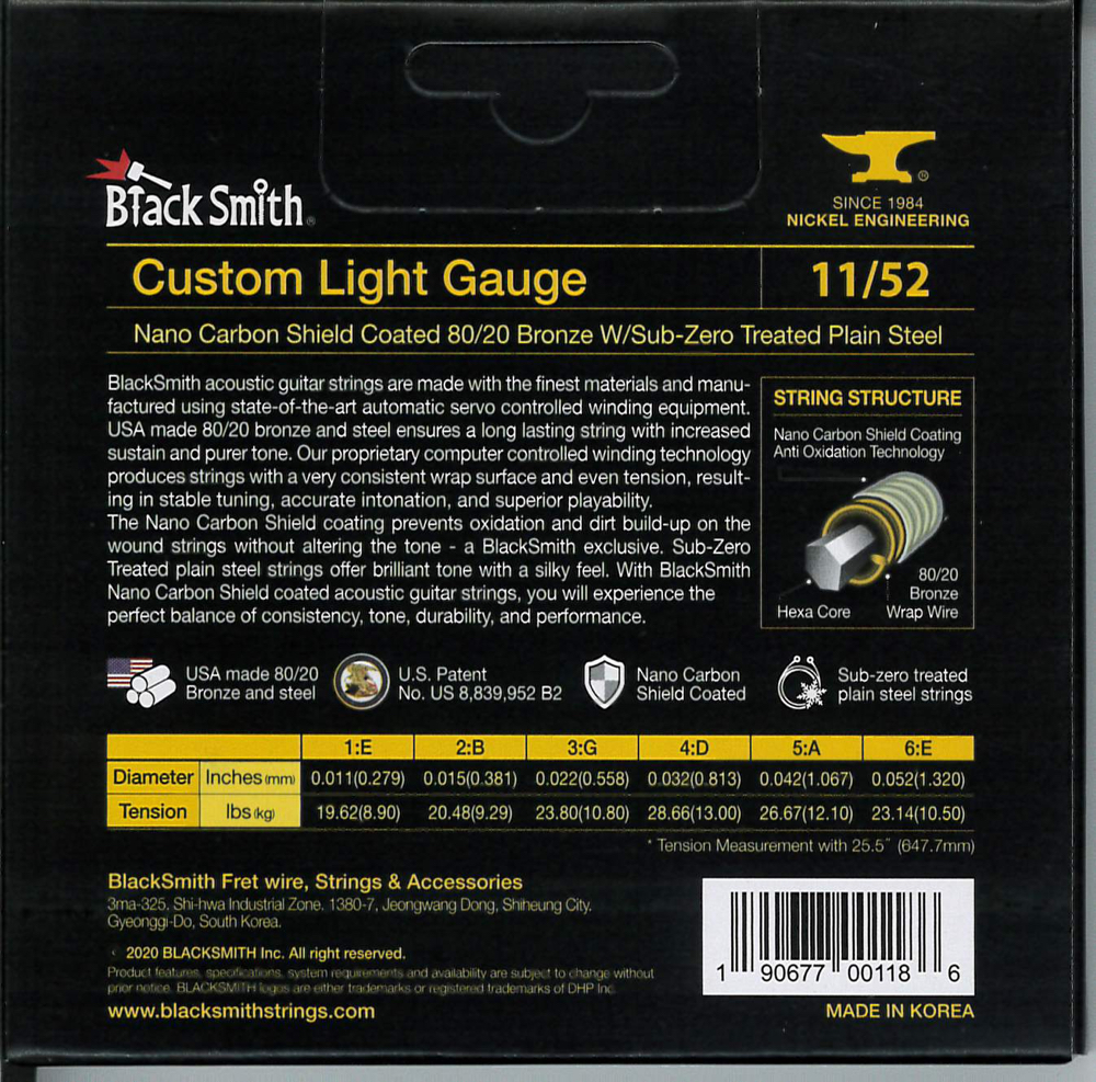 BlackSmith-exkluzív Nano Carbon Shield bevonattal rendelkezik, amely megakadályozza az oxidációt és a szennyeződések felhalmozódását anélkül, hogy a hangzást megváltoztatná. A fagyasztással kezelt acél húrok csilingelő hangzást és lágy tapintást adnak. Ez együttesen biztosítja a konzisztencia, a hangszín, a tartósság és a teljesítmény tökéletes egyensúlyát.