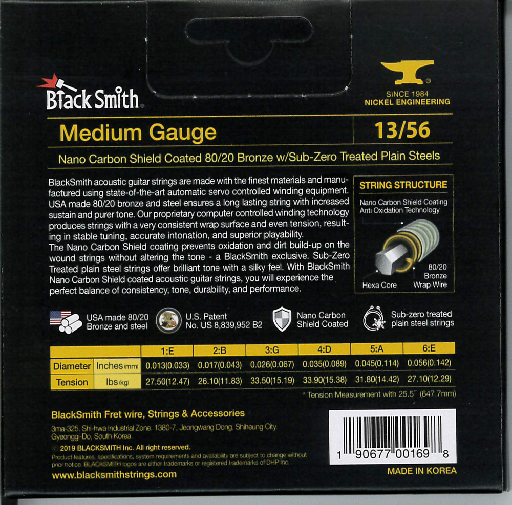 BlackSmith-exkluzív Nano Carbon Shield bevonattal rendelkezik, amely megakadályozza az oxidációt és a szennyeződések felhalmozódását anélkül, hogy a hangzást megváltoztatná. A fagyasztással kezelt acél húrok csilingelő hangzást és lágy tapintást adnak. Ez együttesen biztosítja a konzisztencia, a hangszín, a tartósság és a teljesítmény tökéletes egyensúlyát.