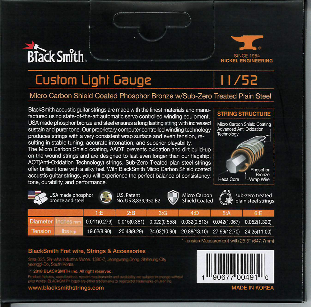 A BlackSmith akusztikus gitár húrok a legkiválóbb alapanyagokból készülnek a legmodernebb tekercselő berendezés használatával. Az USA-ban gyártott foszfor-bronz és acél hosszú élettartamot és megnövelt hangkitartást biztosít. Számítógépvezérelt technológiával egyenletes tekercselést és húrnyomást kapunk, ami stabil hangolást, pontos intonációt és kiváló játszhatóságot eredményez.