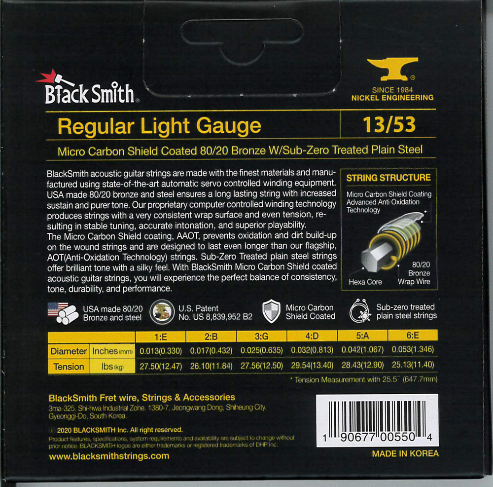 A BlackSmith akusztikus gitár húrok a legkiválóbb alapanyagokból készülnek a legmodernebb tekercselő berendezés használatával. Az USA-ban gyártott 80/20 bronz és acél hosszú élettartamot és megnövelt hangkitartást biztosít. Számítógépvezérelt technológiával egyenletes tekercselést és húrnyomást kapunk, ami stabil hangolást, pontos intonációt és kiváló játszhatóságot eredményez.
