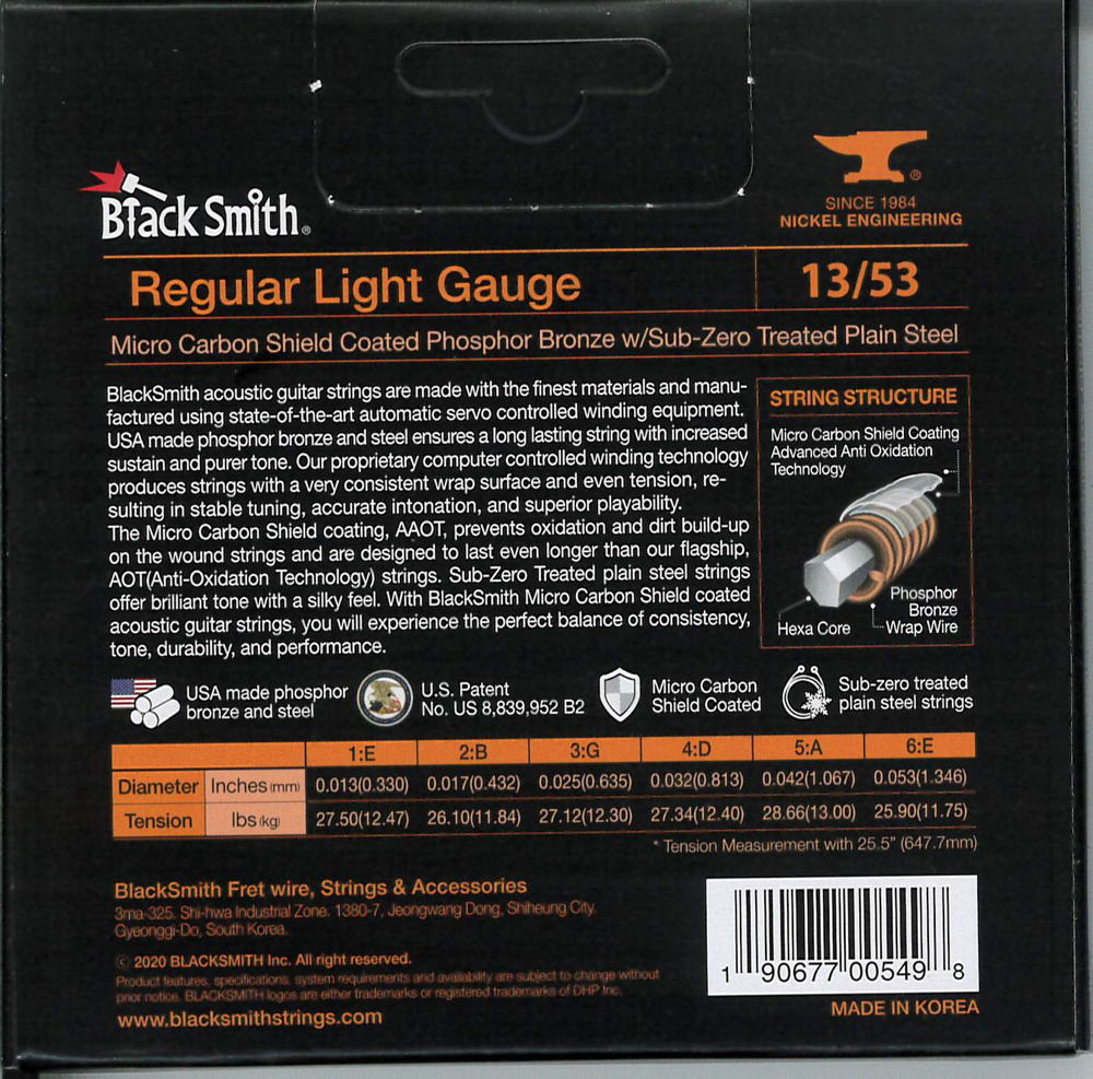 A BlackSmith akusztikus gitár húrok a legkiválóbb alapanyagokból készülnek a legmodernebb tekercselő berendezés használatával. Az USA-ban gyártott foszfor-bronz és acél hosszú élettartamot és megnövelt hangkitartást biztosít. Számítógépvezérelt technológiával egyenletes tekercselést és húrnyomást kapunk, ami stabil hangolást, pontos intonációt és kiváló játszhatóságot eredményez.