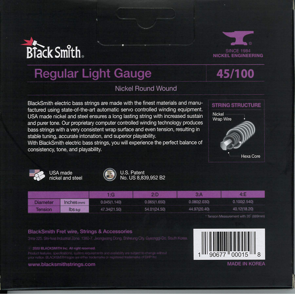 A BlackSmith elektromos basszus húrok a legkiválóbb alapanyagokból készülnek a legmodernebb tekercselő berendezés használatával. Az USA-ban gyártott nikkel és acél hosszú élettartamot és tisztább hangzást kölcsönöz, mint a hagyományos nikkel tekercselésű húr. Számítógépvezérelt technológiával egyenletes tekercselést és húrnyomást kapunk, ami stabil hangolást, pontos intonációt és kiváló játszhatóságot eredményez. Az egyedülálló, szabadalmazott vákuumzárású, csavarodásmentes csomagolásnak köszönhetően a húr nem rozsdásodik és nem sérül.