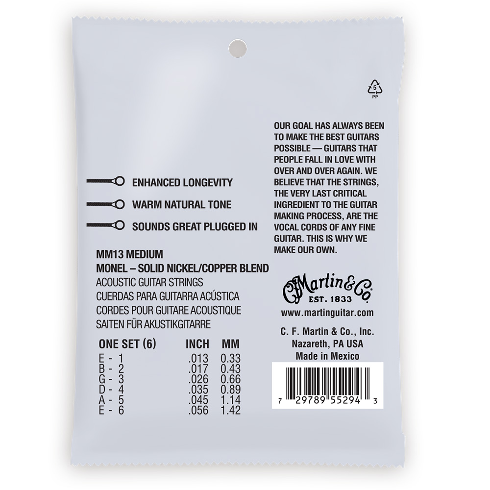 Martin® Retro® akusztikus gitárhúrok kialakítása megegyezik a bronz húrok előtti időszakban gyártott, nikkel alapú ötvözetből készült akusztikus húrokéval, melynek meleg, lágy és a hangszer hangját jobban érvényesítő tulajdonságai vannak. A monel ötvözet (2/3 nikkel, 1/3 réz) egy nagyon korrózióálló tartós anyag, lágy, igazi vintage hangzással.