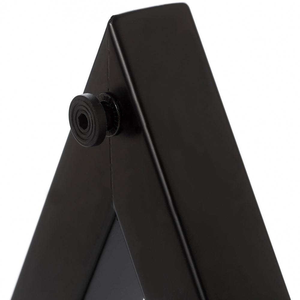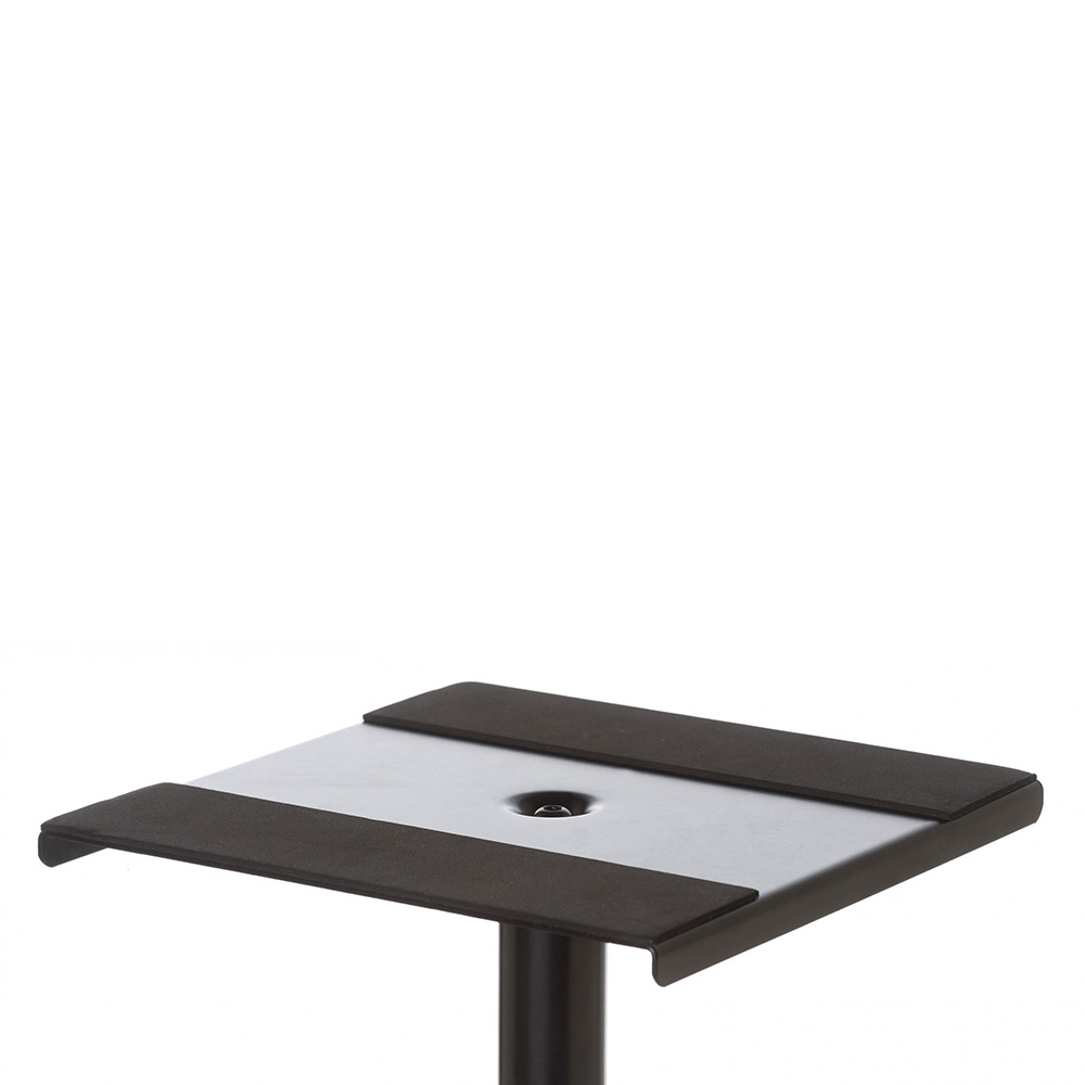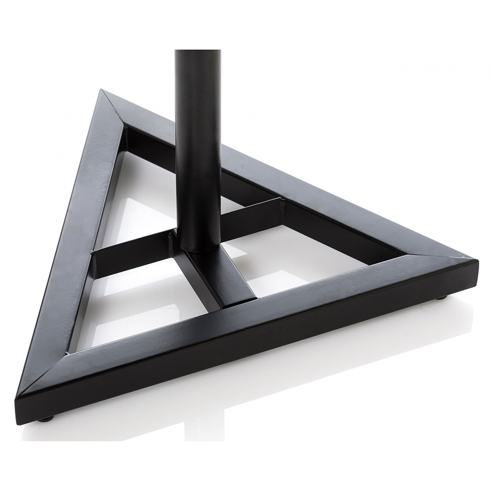 Hangfalállvány, tálcás kivitelben. Külső acél csőváz (40x1,2 mm) és belső alumínium cső (35x1,2 mm), teleszkópos magasság állítással. Legrugos rendszere könnyű és biztonságos beállítást biztosít. Talapzata acél, háromszög alakú.
