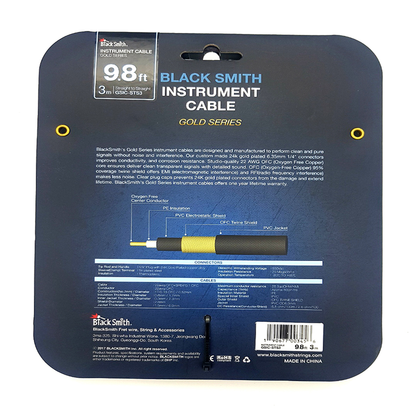 A BlackSmith Gold széria hangszerkábeleit a tiszta, zajmentes jeltovábbításra tervezték. A 24K arany bevonat a 6,35 mm-es sárgaréz jack csatlakozókon növeli a vezetőképességet és gátolja a korróziót. A stúdió minőségű 22 AWG OFC (Oxygen Free Copper - oxigénmentes réz) mag biztosítja a veszteség nélküli jeltovábbítást. A 95%-os OFC árnyékolás kiküszöböli az EMI (elektromágneses interferencia) és RFI (rádiófrekvenciás interferencia) hatását, így biztosítja a zajmentességet.