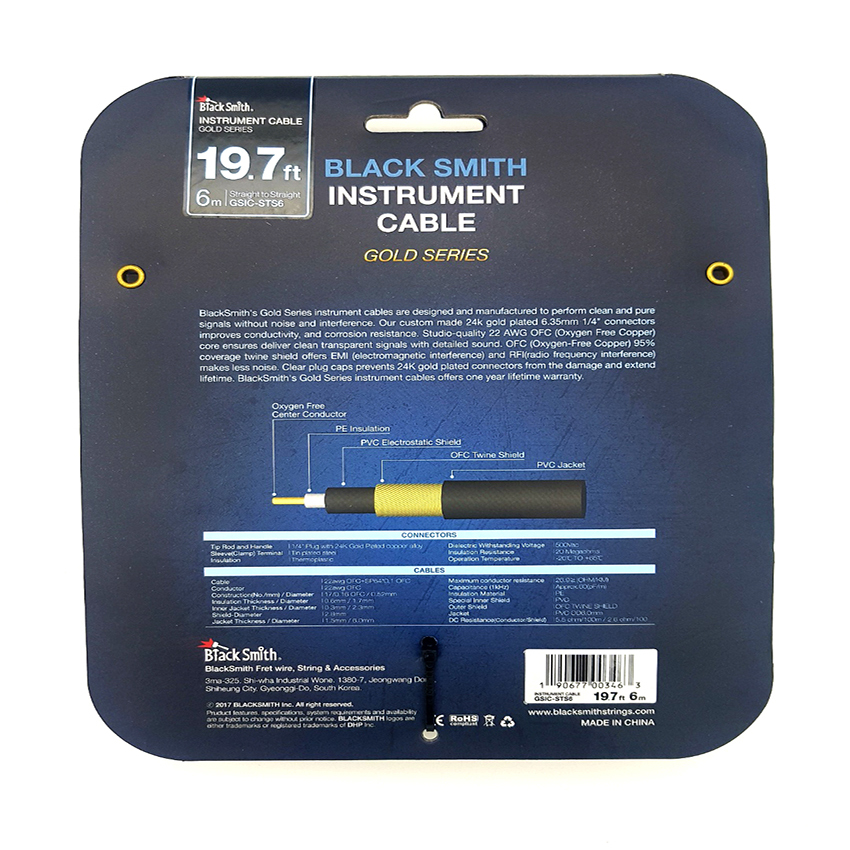 A BlackSmith Gold széria hangszerkábeleit a tiszta, zajmentes jeltovábbításra tervezték. A 24K arany bevonat a 6,35 mm-es sárgaréz jack csatlakozókon növeli a vezetőképességet és gátolja a korróziót. A stúdió minőségű 22 AWG OFC (Oxygen Free Copper - oxigénmentes réz) mag biztosítja a veszteség nélküli jeltovábbítást. A 95%-os OFC árnyékolás kiküszöböli az EMI (elektromágneses interferencia) és RFI (rádiófrekvenciás interferencia) hatását, így biztosítja a zajmentességet.