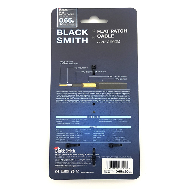 A BlackSmith lapos patch kábeleit a tiszta, zajmentes jeltovábbításra tervezték. A nikkel-króm bevonat a 6,35 mm-es jack csatlakozókon növeli a vezetőképességet és gátolja a korróziót. A 26 AWG OFC árnyékolás kiküszöböli az EMI (elektromágneses interferencia) és RFI (rádiófrekvenciás interferencia) hatását, így biztosítja a zajmentességet. A BlackSmith lapos patch kábelekkel helyet takaríthatunk meg a pedalboardon, miközben megőrizzük a tiszta, veszteségmentes hangot.