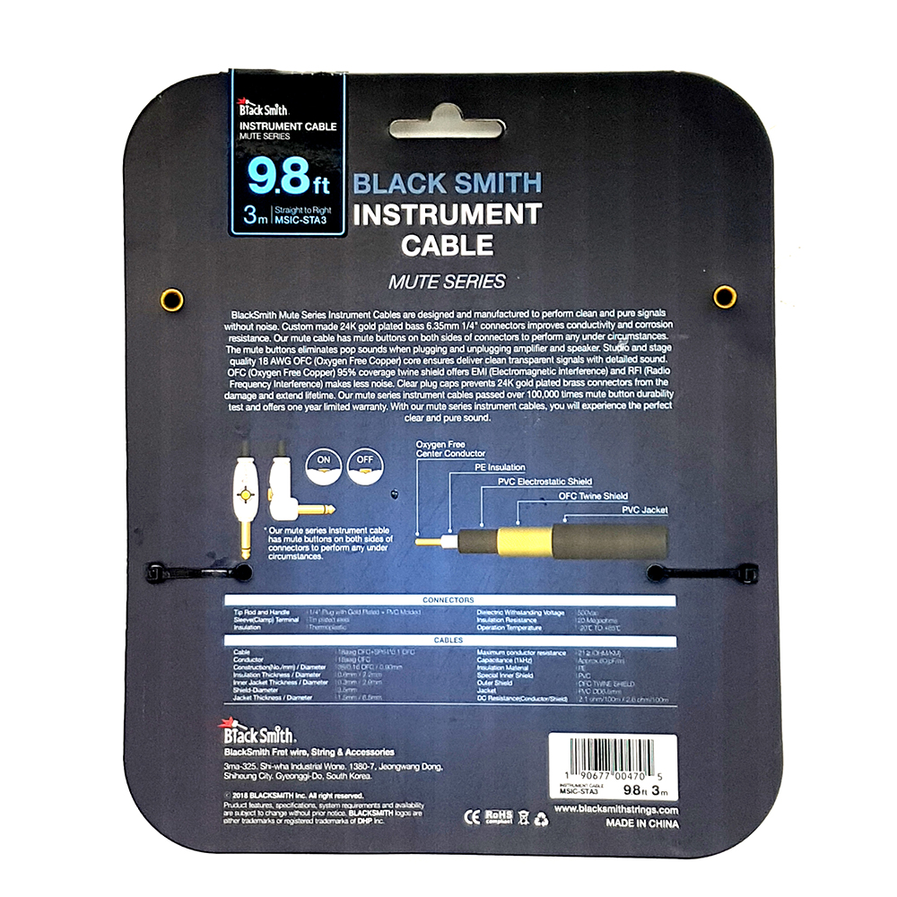 A BlackSmith Mute széria hangszerkábeleit a tiszta, zajmentes jeltovábbításra tervezték. A 24K arany bevonat a 6,35 mm-es sárgaréz jack csatlakozókon növeli a vezetőképességet és gátolja a korróziót. A Mute kábelek csatlakozói mute gombbal rendelkeznek, ami megszünteti a kattanó hangot az erősítő vagy hangfal csatlakoztatásakor. Ezek a gombok 100 000-szeres tartóssági teszten mentek keresztül. A színpadi és stúdió minőségű 22 AWG OFC (Oxygen Free Copper - oxigénmentes réz) mag biztosítja a veszteség nélküli jeltovábbítást. A 95%-os OFC árnyékolás kiküszöböli az EMI (elektromágneses interferencia) és RFI (rádiófrekvenciás interferencia) hatását, így biztosítja a zajmentességet.