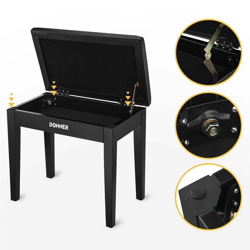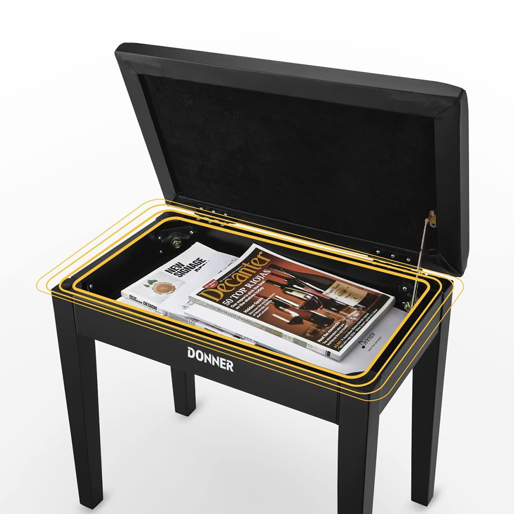 Ideális zongoraszék: A Donner zongoraszékben egy rejtett tároló található, ahol akár kottát vagy egyéb könyveket tárolhatunk. A felnyitható ülőrészt stabil támasztók tartják.