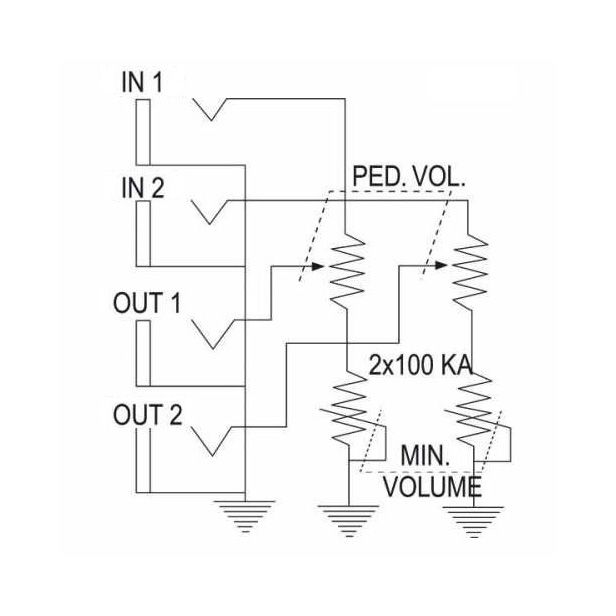 Sztereó hangerő pedál gitárhoz, két különálló 6,3mm jack bemenettel és kimenettel. A pedálon található potméterrel beállíthatjuk a minimum hangerőt. Használható monó pédálként is.