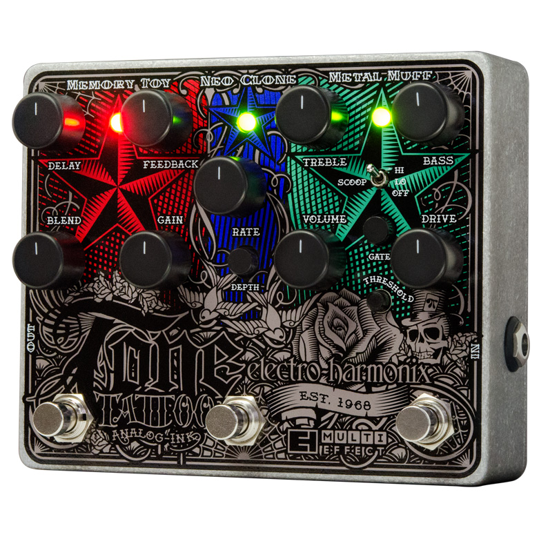 Teljesen analóg multieffekt, Metal Muff torzító, Neo Clone chorus és Memory Toy delay egy dobozban.