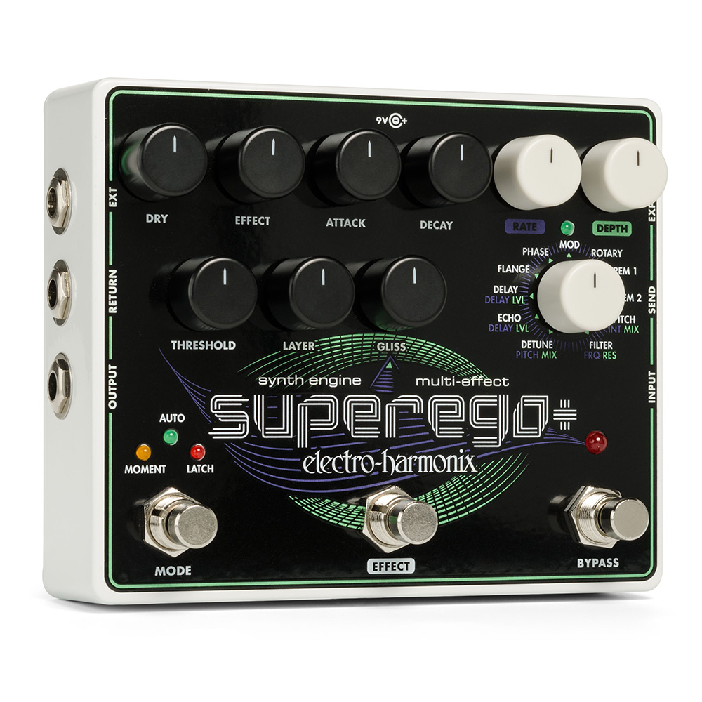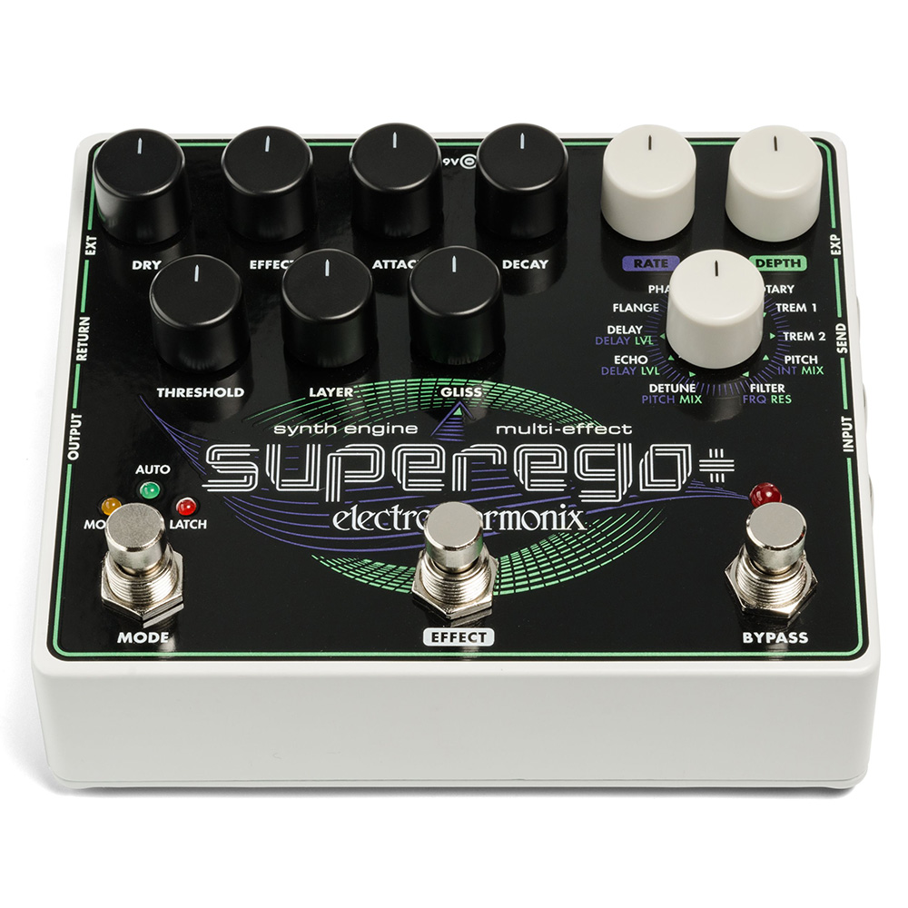 The polyphonic Superego+ works with guitar as well as other instruments including bass, keyboards, vocals, drums, etc. and comes equipped with an EHX 9.6DC-200 AC Adaptor.