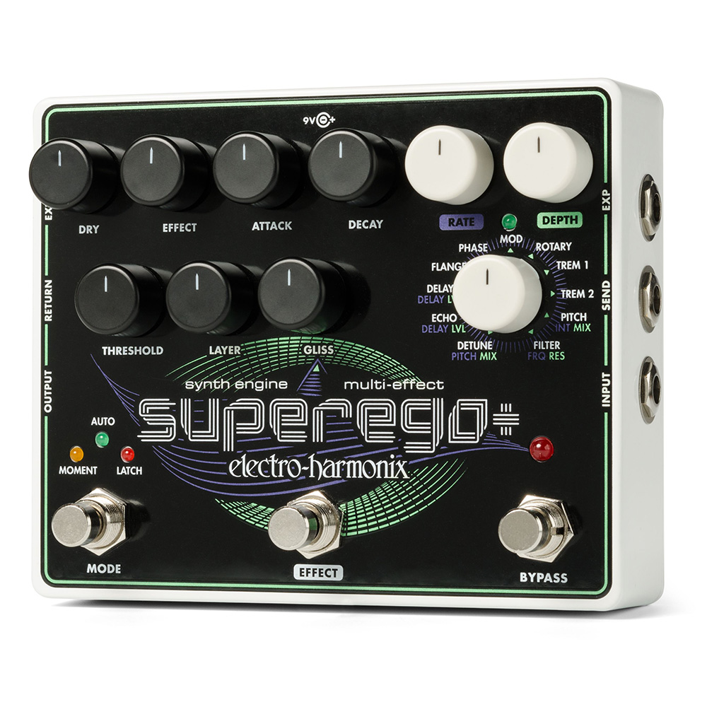 Building on the synthesis platform of the award-winning Superego, our new Superego+ raises the bar when it comes to creating synth effects, sound layers, glissandos, infinite sustain and more. Plus, we’ve added a complete effects section featuring 11 effects types, an EXP input for effect parameter control/preset recall and an EXT jack for a 3-button controller.