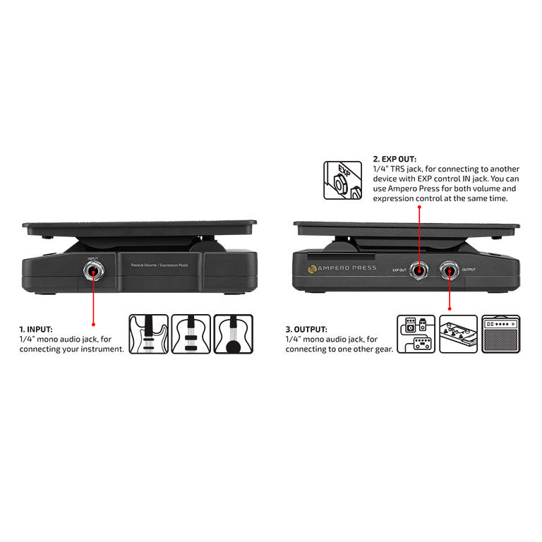 Az Ampero Press 25kΩ Edition egy kompakt, passzív 2in1 hangerő/expression pedál, amelyet főleg, de nem kizárólag az Ampero II Stomp számára terveztek, hanem más zenei eszközökhöz is (amelyek rendelkeznek olyan EXP pedál csatlakozóval, amelyhez 25kΩ EXP ellenállás szükséges) vagy egyszerűen passzív hangerő pedálként is használható. Strapabíró alumínium ötvözetből készült házban, zökkenőmentes és kényelmes felhasználói élményt ad.