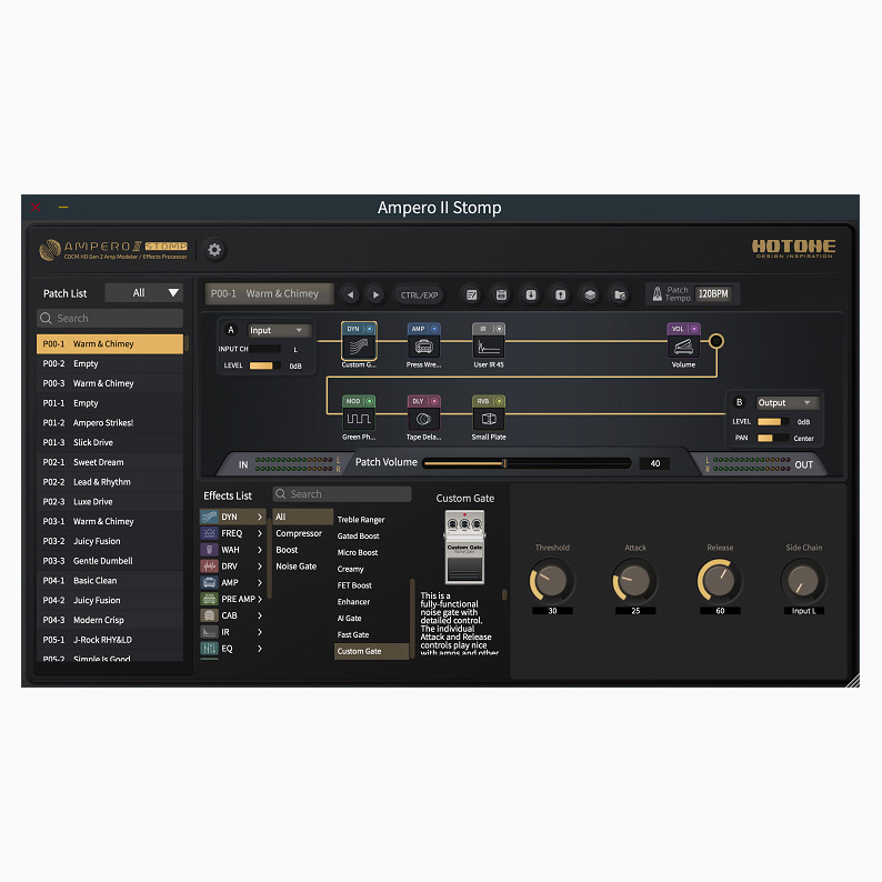 - 60+ a Hotone legjobb effektje közül, köztük distortion, dynamic, filter, modulation, delay, reverb stb.