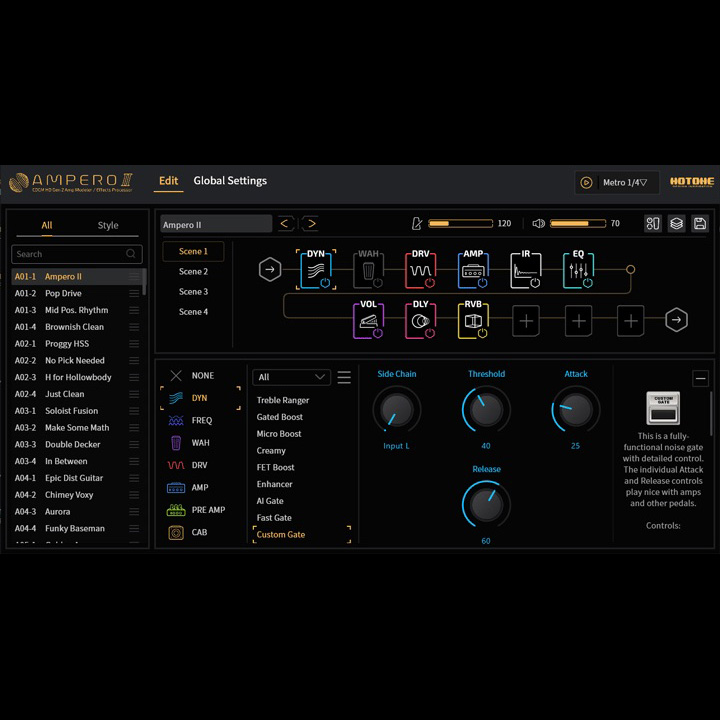 Élvonalbeli Tone Catch Technológia: Az Ampero II támogatja a Tone Catch technológiát, amely lehetővé teszi, hogy kedvenc erősítőinek és pedáljainak hangját közvetlenül a processzorba rögzítse. A Hotone közösségen keresztül megoszthatod és felfedezheted a világ minden tájáról származó felhasználók hangzásait!