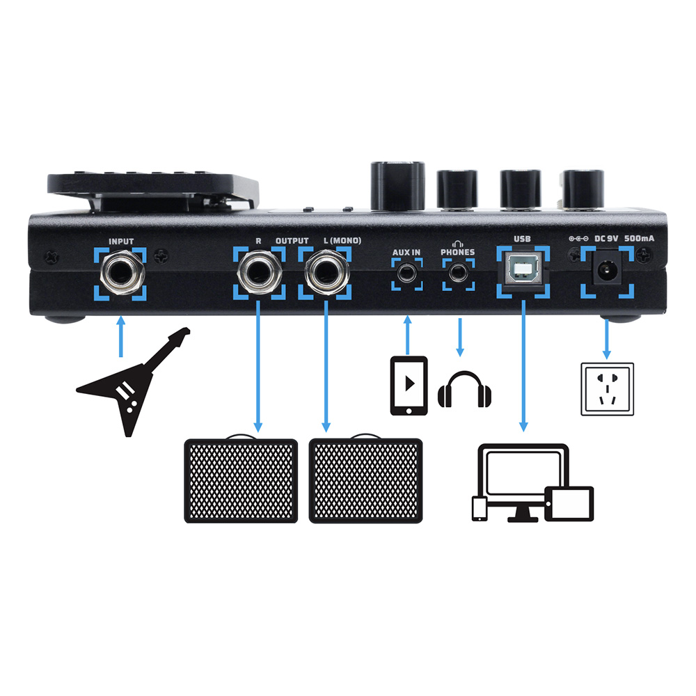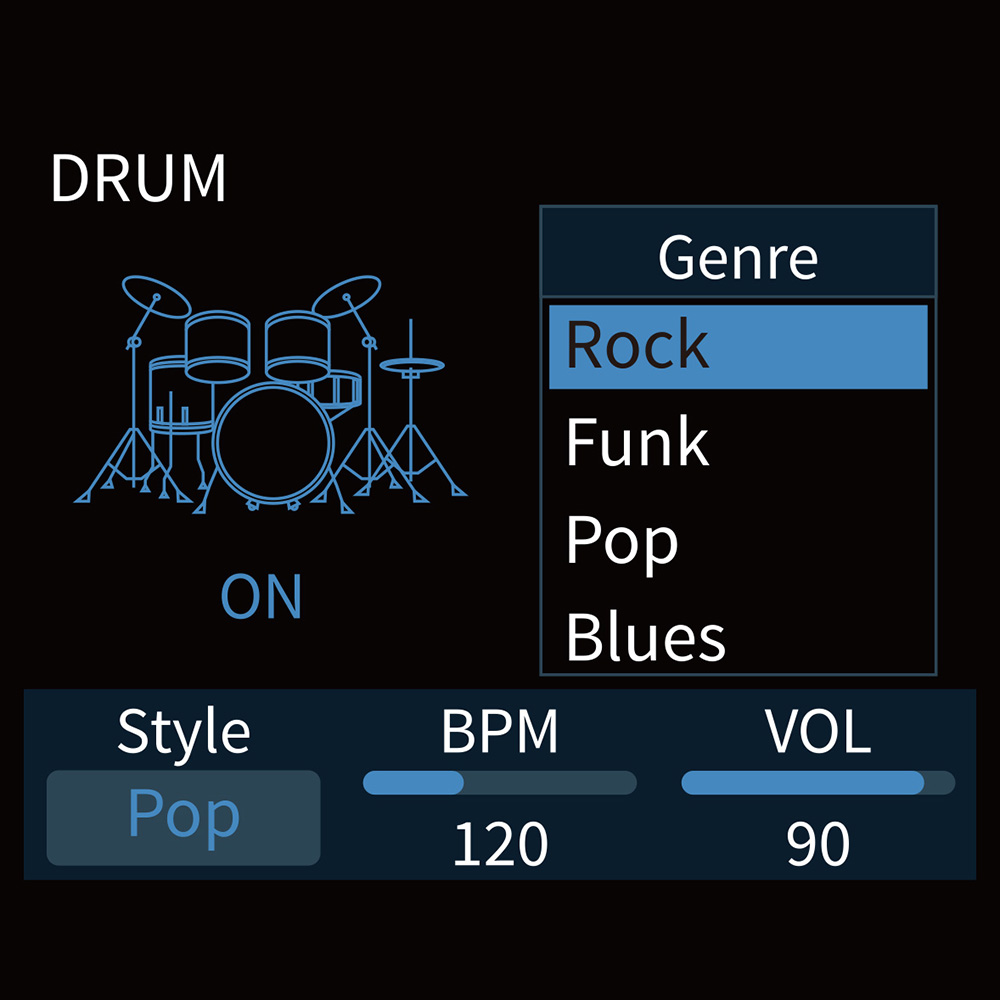Beépített looperrel (max. 90 mp), dobgéppel (100 minta, köztük metronómok) és aux bemenettel rendelkezik.