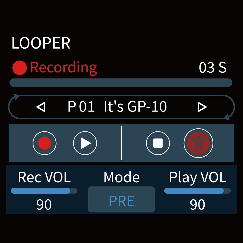 A GP-100 sajátossága egy pre-effekt looper, tehát az effektek/patch-ek változtatásával változik a loop hangszíne is.