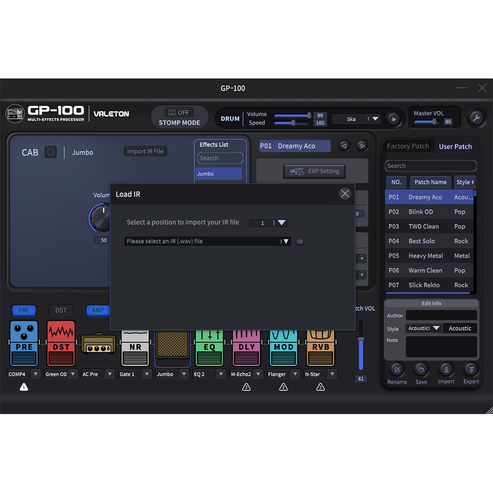 A GP-100-ban megtalálható a HD digitális modellező rendszerünk, amely organikus élő hangzást és több, mint 140 választható effektet biztosít, köztük 45 legendás gitár / basszusgitár / akusztikus erősítő szimulációkat, 40 gyári hangláda IR-t és 198 presetet (99 felhasználói és 99 gyári).