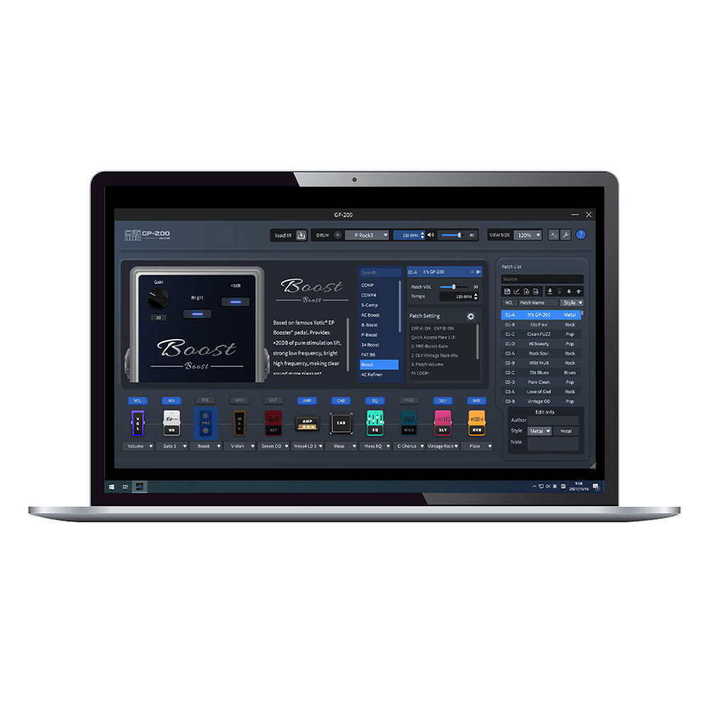 A GP-200 tizenegy szimultán váltható effektmodullal rendelkezik, és mindegyik független szimulációt futtat. Ezeknek a sorrendje szabadon változtatható, így kísérletezhetsz és megtalálhatod a saját hangzásodat.
