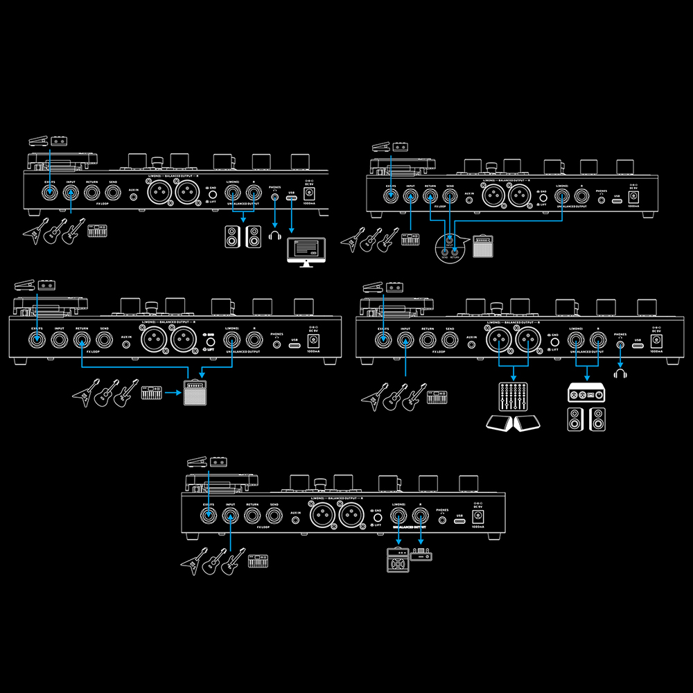 - Akár 11 szabadon mozgatható és szimultán is működtethető modul az effektláncban