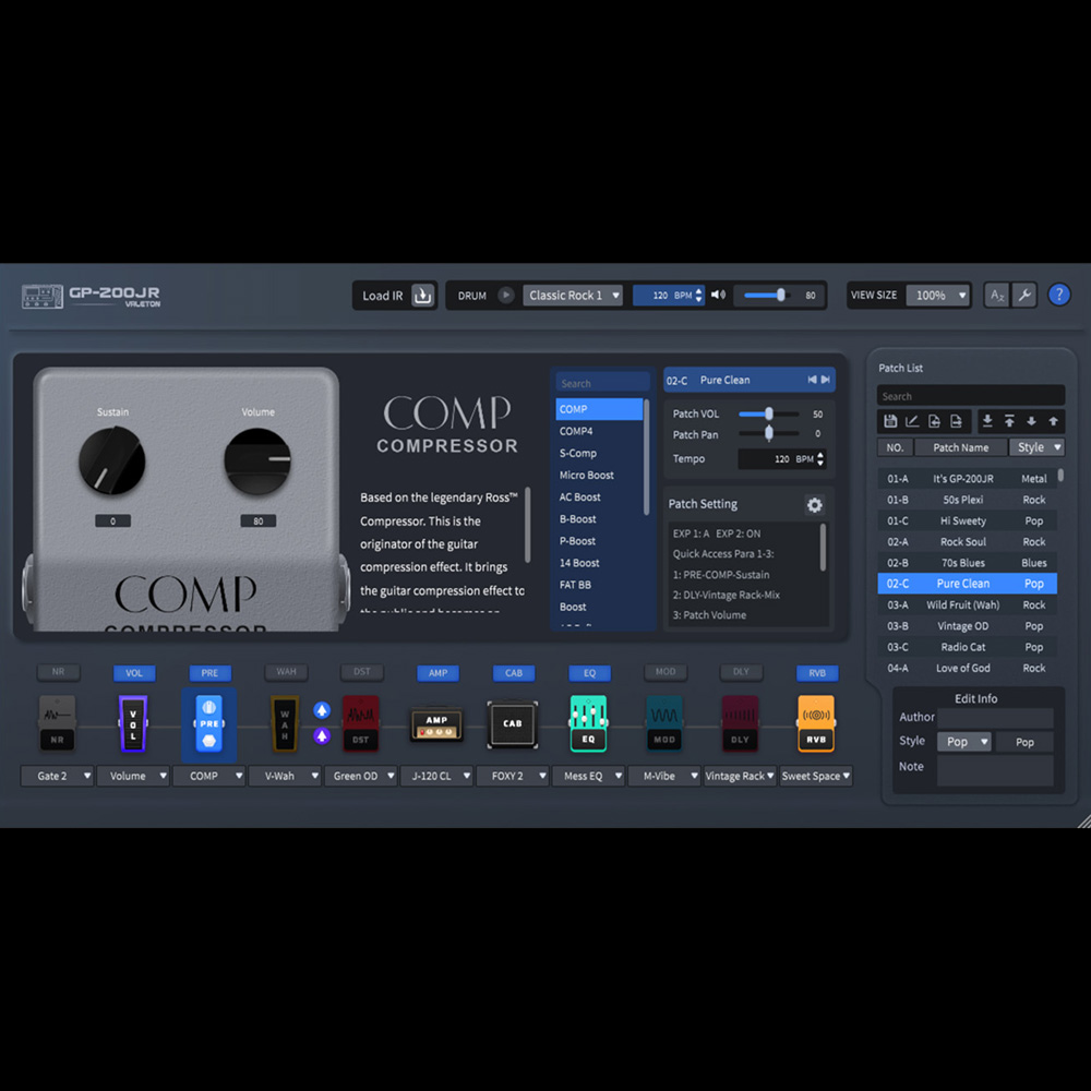 A GP-200JR a Valeton újgenerációs GP szériájának legújabb tagja, egy kompakt HD modellező multieffekt processzor. Szériájának zászlóshajójához, a GP-200-hoz képest a GP-200JR mérete jelentősen csökkent, viszont megmaradtak a vezérlő funkciók: a képernyő és a gombok, a teljes felhasználói felület, valamint az érzékeny és hatékony beépített pedál. Könnyebben hordozható, és közben bármilyen felhasználási környezetben maximálisan megtartja a funkcionalitását. A hangzását tekintve, mivel a GP széria második generációs digitális platformján és HD modellező technológiáján alapszik, 11 szabadon mozgatható effektmodult és több mint 240 patch-et biztosít: világklasszis hangszórók, IR-ek és effektek modelljeit. A GP-200JR ezen kívül loopert, dobmintákat, hangolót és Win/Mac szerkesztőszoftvert is tartalmaz, vagy közvetlenül audio interfészként is használható, amely több platformmal (Windows/Mac/iOS/Android) is kompatibilis, így nagyszerűen használható dalíráshoz, gyakorláshoz és felvételekhez.