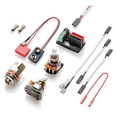 Package Includes: EMG's exclusive Solderless Install System (Patent pending); split shaft volume/active tone control set, output jack, battery clip set, screws & springs.