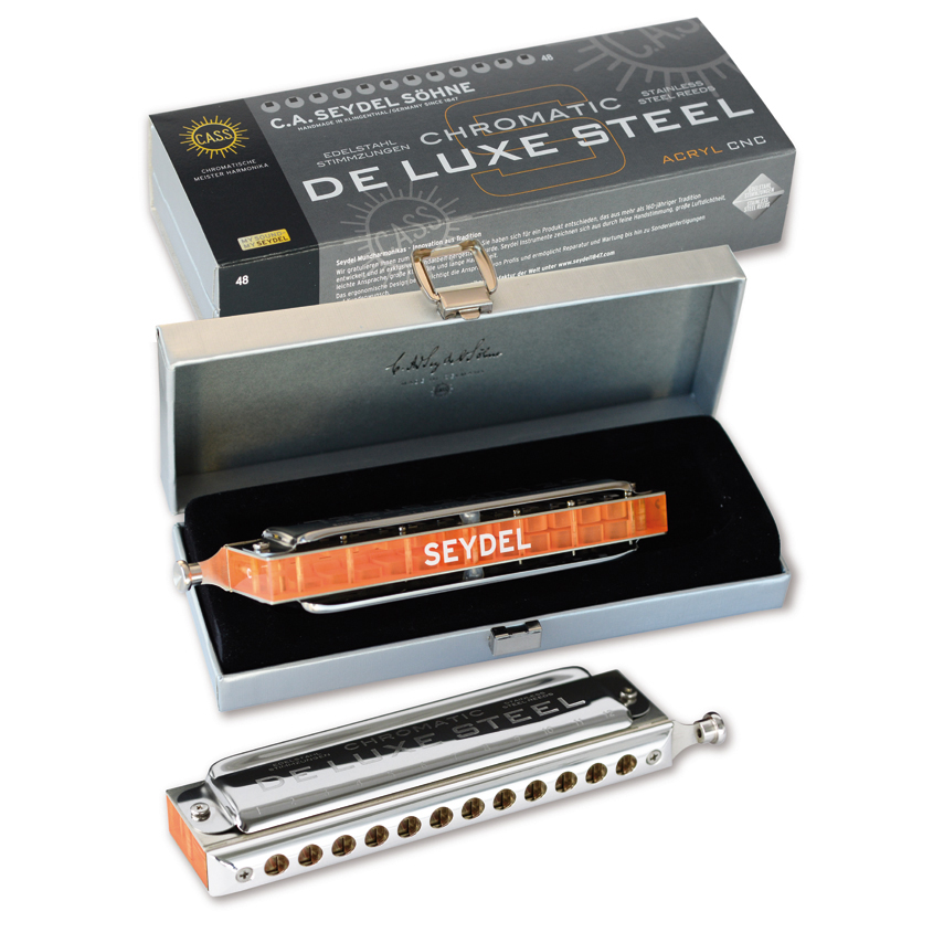 A Seydel Chromatic DeLuxe Steel kromatikus (váltós) szájharmonika egy kiváló minőségű, rozsdamentes acél lamellákkal szerelt, nagyon jó ár-értékű hangszer. 12 hanglyukú, 48 hangú, három és fél oktávos, narancs színű akril (acryl) testtel, kiváló légtartással. A hanglyukak kör alakúak, a fúvóka lekerekített.