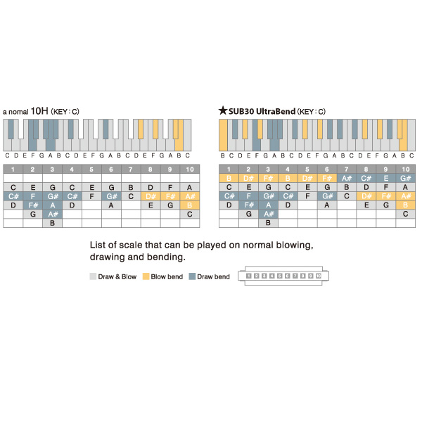 Klasszikus 10 hanglyukú, diatonikus szájharmonikán kromatikus (fél hangokat is tartalmazó) skálát kijátszani eddig kizárólag az igen nehéz és bonyolult, ún. "overblow/overdraw" (túlfújásos) technika elsajátításával lehetett. A Suzuki új SUB30 Ultra Bend speciális kialakítású, 10 hanglyukú szájharmonikája lehetővé teszi, hogy az egyszerűbben elsajátítható "hajlítás" technikájának helyes alkalmazásával, teljes kromatikus skála is kijátszható legyen a hangszeren, ezáltal több zenei műfajban (jazz, pop, klasszikus zene és természetesen a blues) és szélesebb zenei környezetben is jól használható. A normál 10 hanglyukú, diatonikus szájharmonikákon általában 8 hangot tudunk hajlítás technikájával kijátszani, míg a forradalmian új Suzuki SUB30 Ultra Bend harmonikán 18-at! Természetesen a hajlítás technikájának helyes elsajátítását követően, de nincs szükség a nehéz, "overblow/overdraw" (túlfújásos) technika megtanulására, alkalmazására. Kizárólag "normál" hajlítással kijátszható az összes félhang. Az új Suzuki SUB30 Ultra Bend szájharmonika új dimenziókat nyithat, valamint kreatív játéktechnika lehetőségét nyújthatja a szájharmonikázásban. |