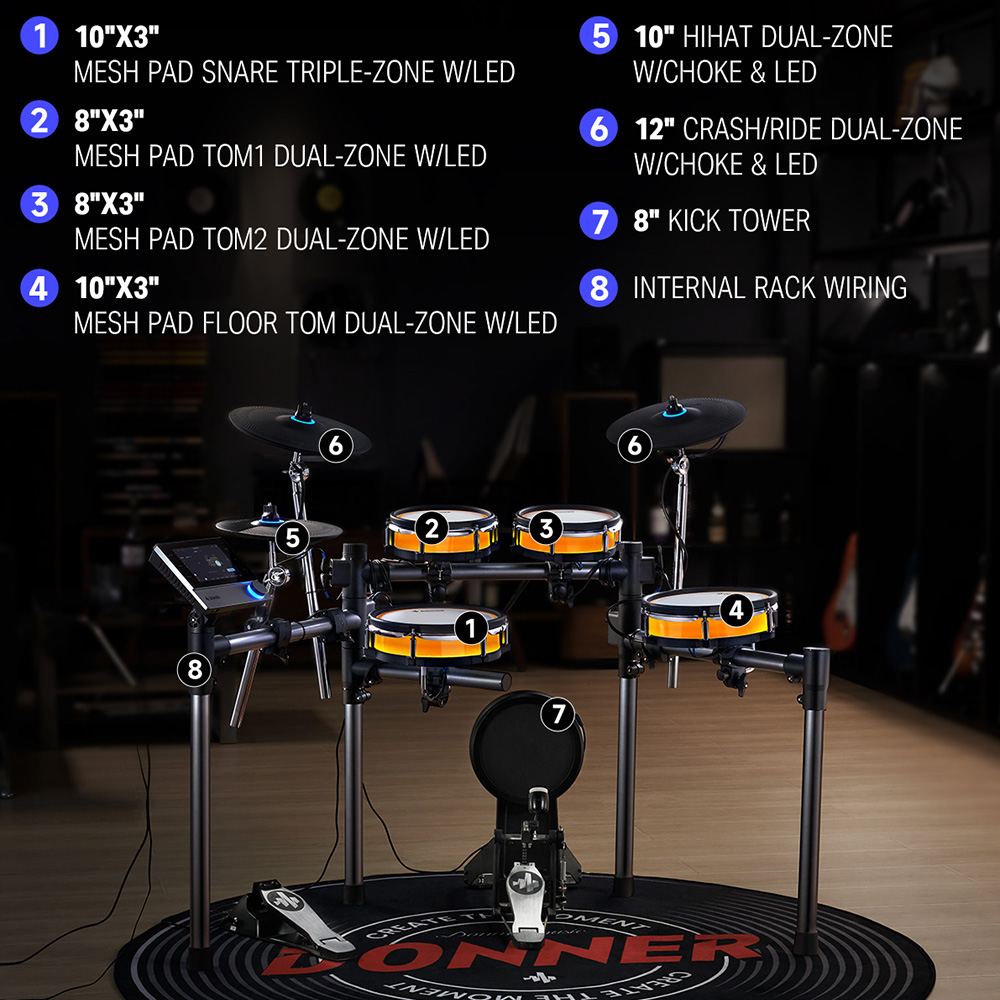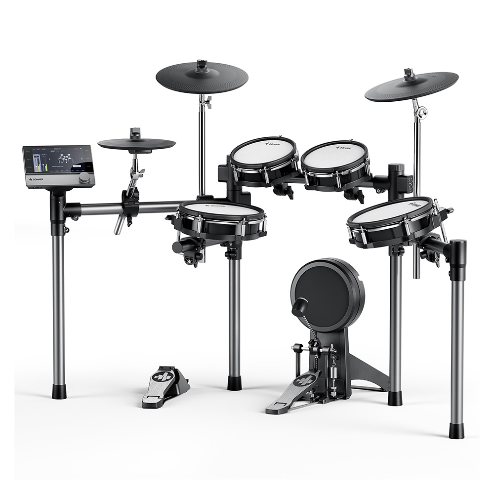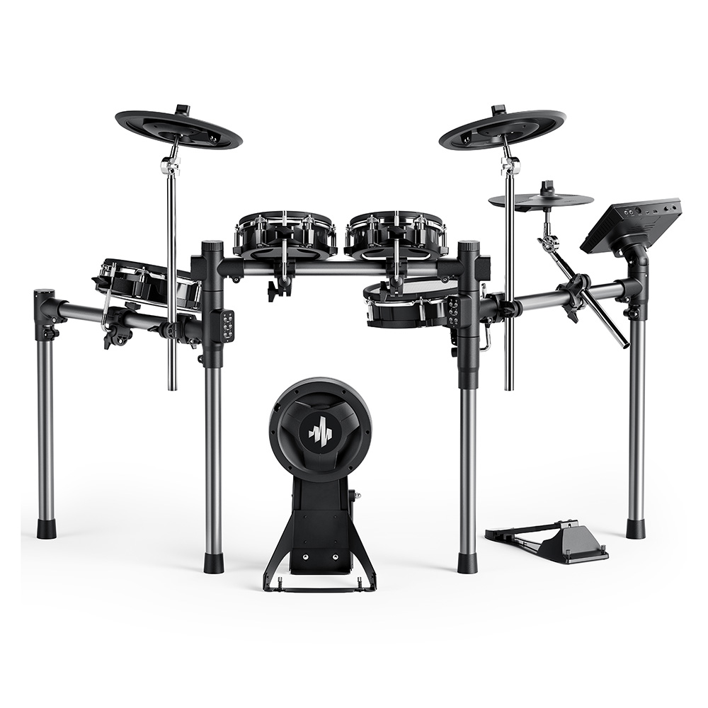 Nyolcdarabos elektromos dobszett: lábdob (duplázó támogatással), 2 kétzónás hálóbőr dobfelület, 3 kétzónás cintányér (tompítóval)