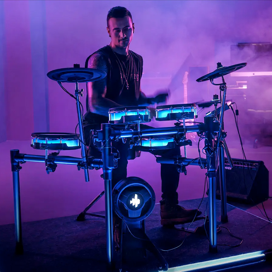- Crash és Ride: 12" kétzónás, tompítással, LED